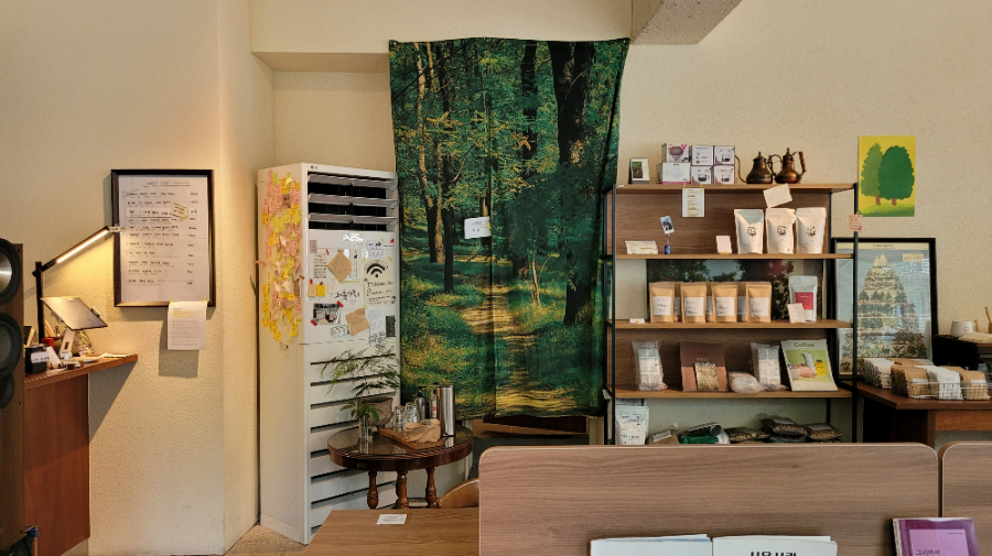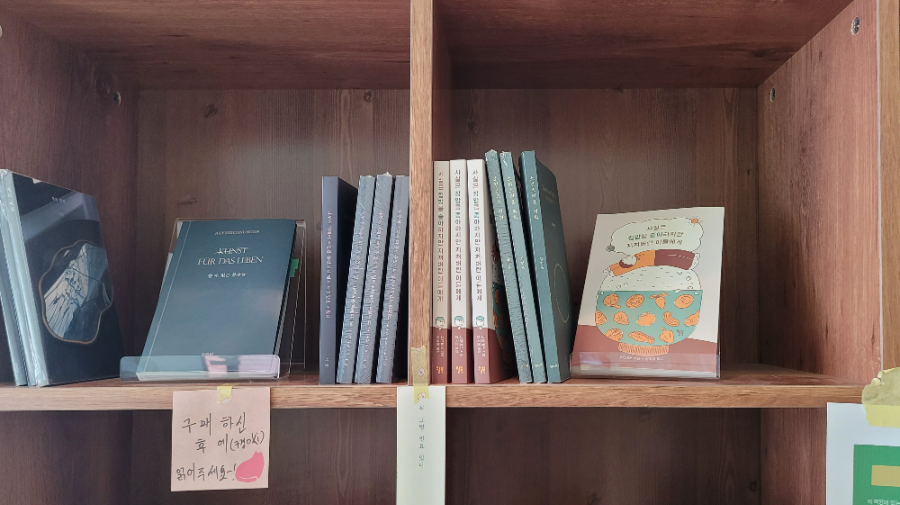책도 판매하고 있는데요, 조용할 때 책 읽기 좋은 공간이에요.