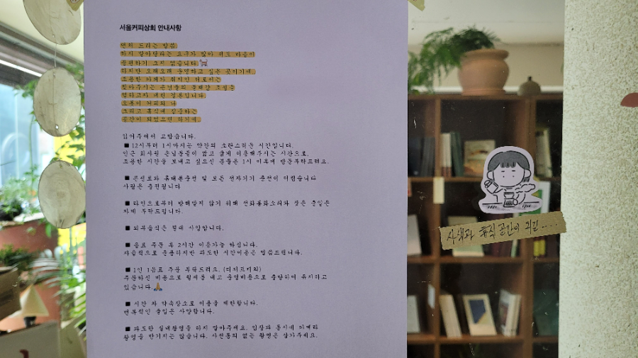 카페 이용 안내에 대한 글도 여기저기 붙여져 있었어요. 조용한 카페를 운영하고자하는 사장님의 마음을 엿볼 수 있었습니다.