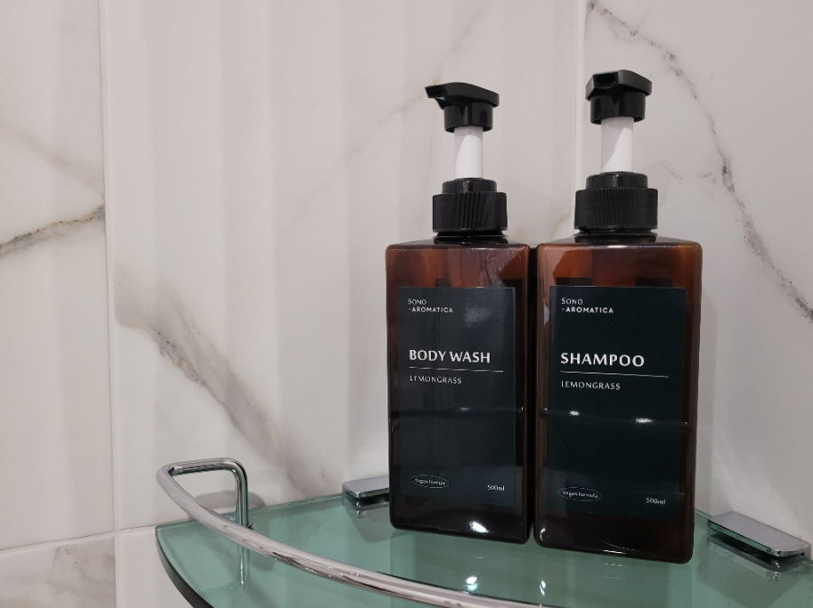 어메니티는 비누 1개와 샴푸, 바디워시가 준비되어있어요. 치약, 칫솔은 별도로 준비해가야합니다.