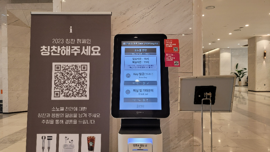 체크인/체크아웃은 로비의 키오스크에서 번호 대기표를 받은 후, 카운터에서 진행됩니다. 모바일 체크아웃도 될 것 같았는데, 이튿날 앱에서 스마트객실 연결이 끊어지더라고요.