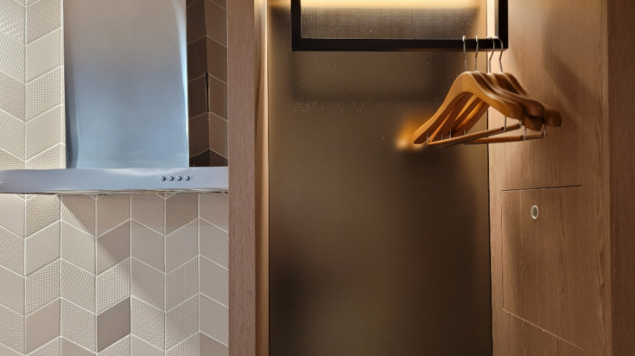 화장대 위에 티슈와 헤어 드라이기가 놓여있고, 빨래 건조대도 안쪽에 1개 있어요. 저희는 투숙 기간 동안 워터 파크를 다녀왔기에, 빨래 건조대도 유용하게 사용했어요.