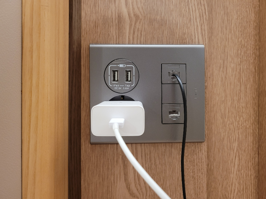 Next to the bed, there are USB ports in the power outlets. I found this convenient for charging multiple phones and tablets.