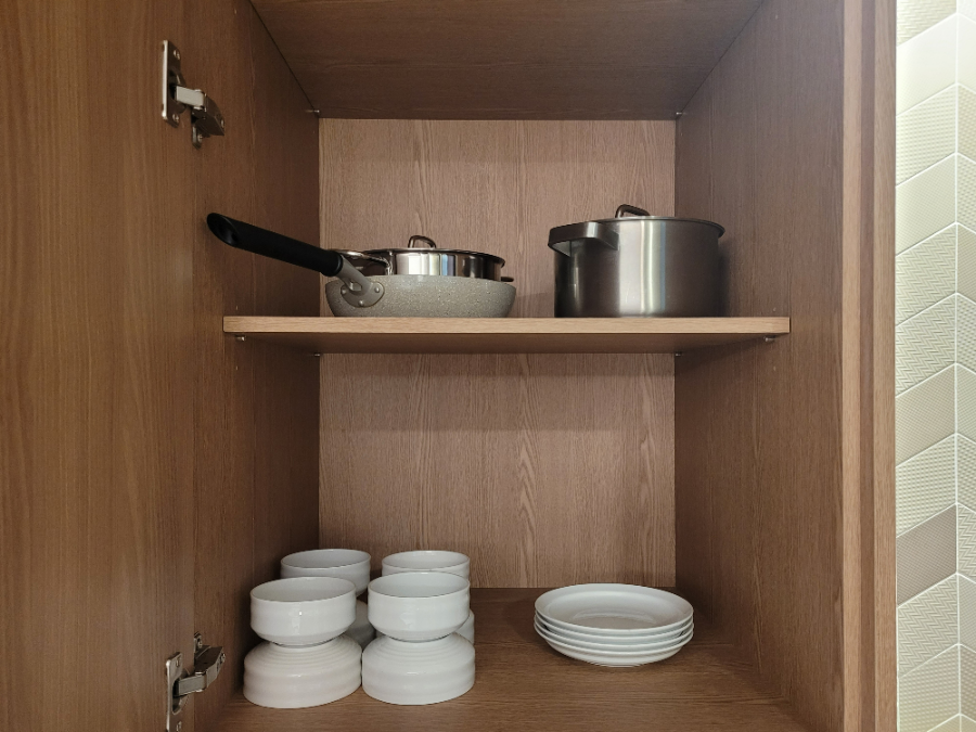밥솥, 도마, 칼, 가위 등 식사를 준비할 수 있는 기본 조리도구도 준비되어있어요. 식기류도 다 4인 기준으로 준비되어있습니다.