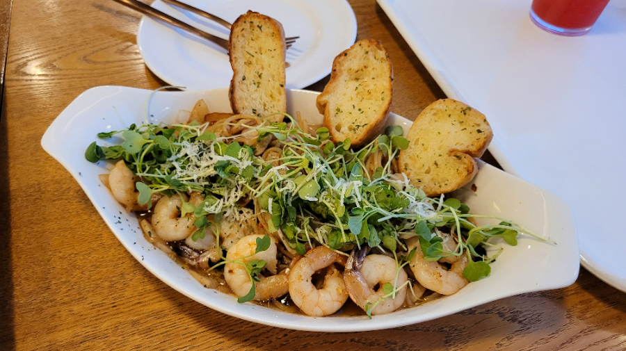 감바스 파스타는 살짝 매콤하지만 맛있었어요. 새우도 꽤 많이 들어있었어요.