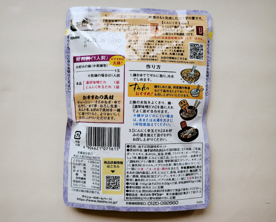 The Daisho Abura Soba Kit is actually a collaboration product with the famous Sapporo Sumire Ramen restaurant. I'll definitely make it a point to visit if I ever travel to Sapporo in the future.