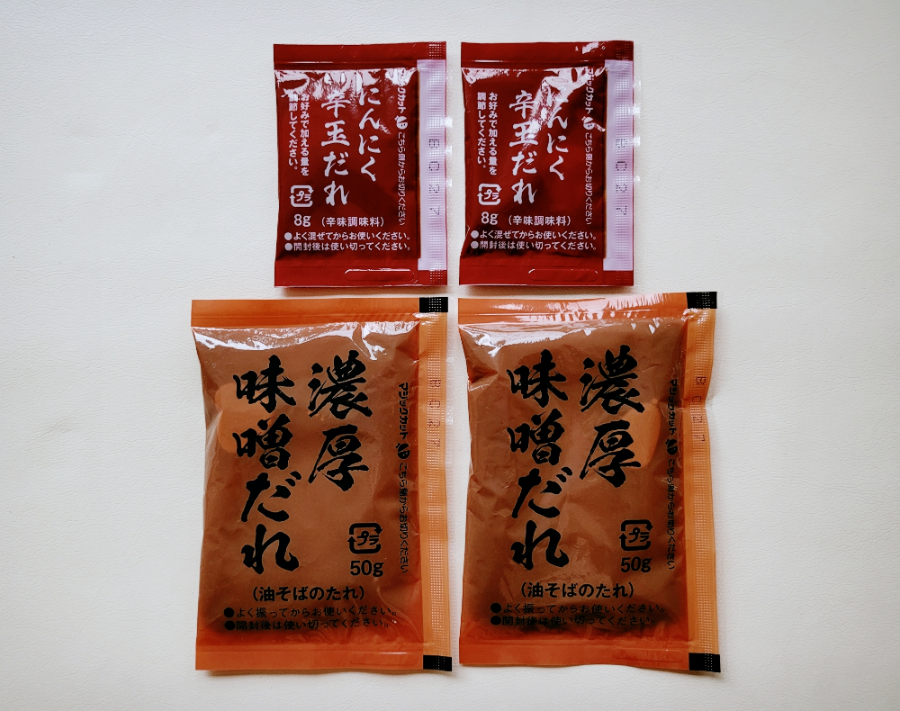 The contents are quite simple. It contains two packets each of the miso sauce and garlic sauce. You can adjust the spiciness according to your preference with the red packet of garlic sauce.