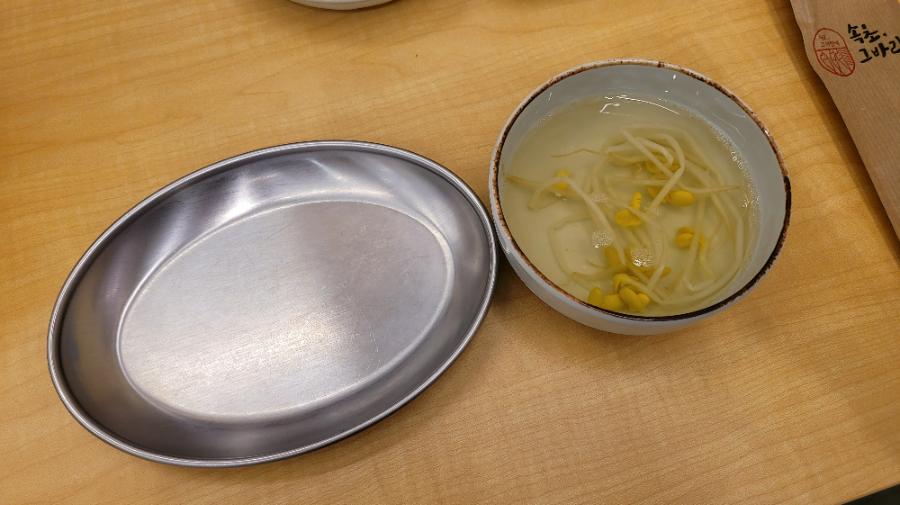 가장 먼저 앞접시와 콩나물국을 갖다주셨어요. 생선구이집이다보니, 생선살을 발라먹기 좋은 납작한 접시를 주시네요 :)