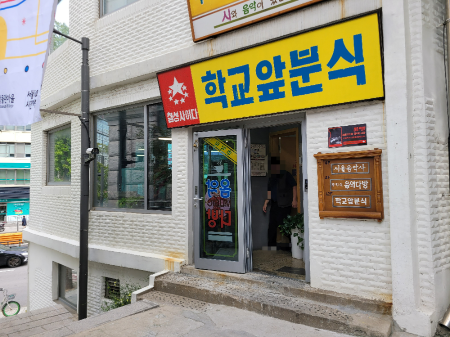 '학교앞분식' is a Korean-style snack bar with a 90s concept. The prices are quite reasonable, and it is operated by the Senior Avengers Social Cooperative, dedicated to providing job opportunities for seniors.