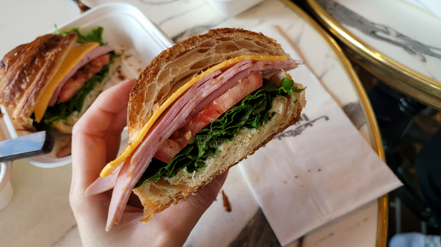 I cut the sandwich with the knife provided by the store. It was a crispy croissant sandwich with fresh ingredients such as cheese, ham, tomato, and lettuce.