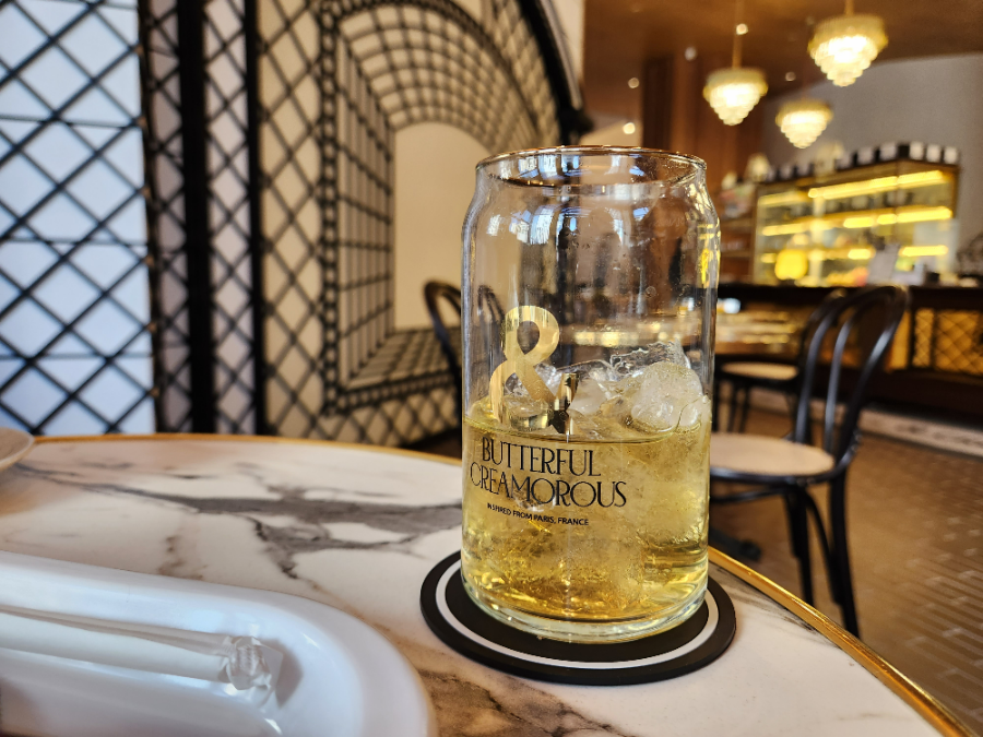 짝꿍은 사과주스를 마셨는데, 같이 주신 얼음잔이 예쁘더라고요. 맥주잔 같기도 하고. (버터풀 앤 크리머러스가 프랑스 파리에서 영감을 받았다고 써있네요.)