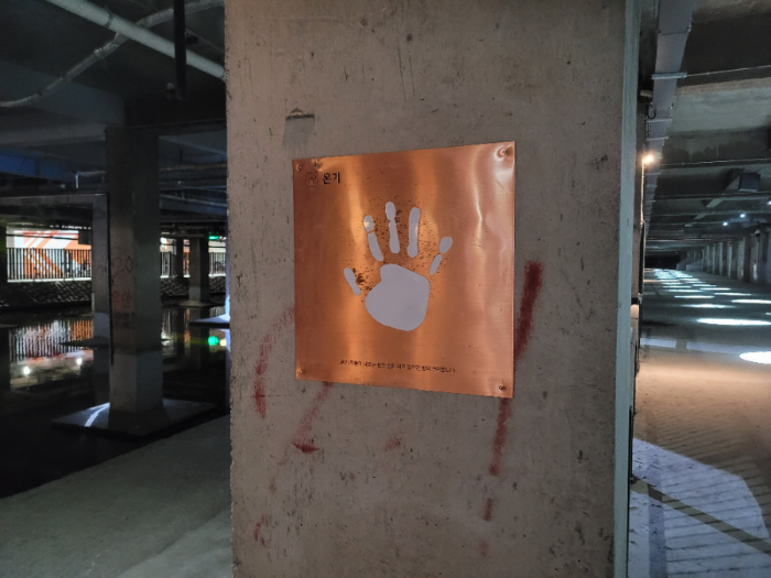 The term '홍제' is said to mean "to widely share" or "to help many." In the past, it is said that Hongje stream was a well-known, popular laundry area that stayed warm even in winter. It was a gathering place for people, a hub for social interaction. If you place your hand on the palm-shaped panel, the space transforms into warm color lights. This artwork is meant to symbolize the warm emotions associated with Hongje stream.