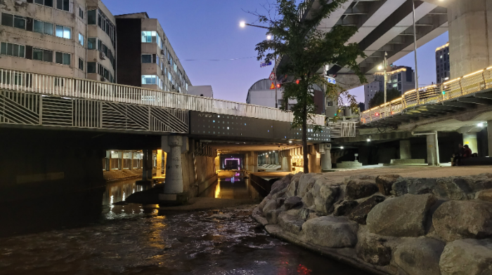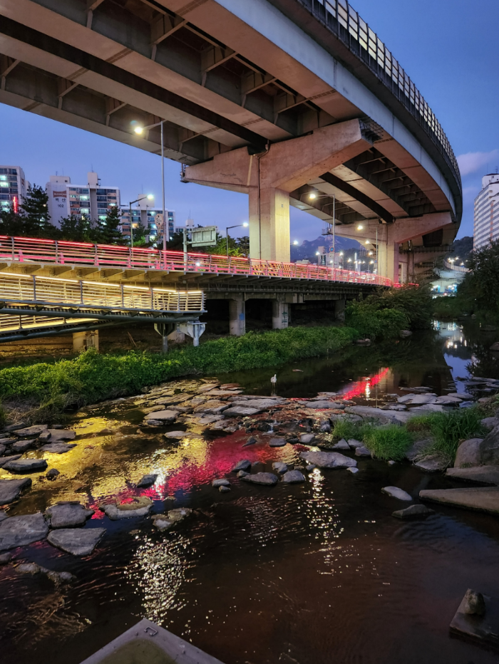 이제 홍제 유연 안으로 들어가 보겠습니다. 홍제천 중간에는 이렇게 징검다리가 있어서, 조명을 감상할 수 있어요. 공간이 감각적이다 보니, 이곳에서 영상 촬영을 하는 모습도 종종 볼 수 있어요.