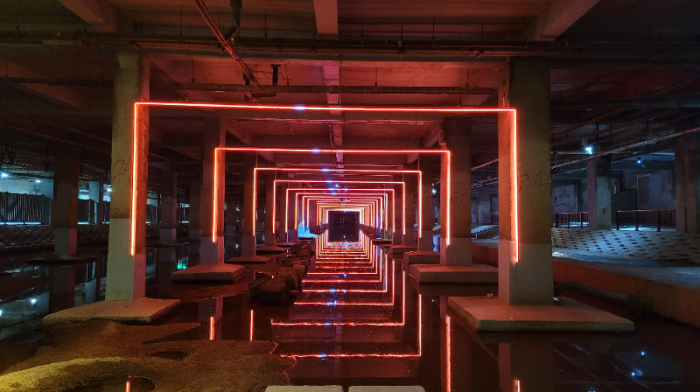 There are also two noticeable Chinese characters. The characters "Sound" (音) and "Light" (明) are arranged upside down to be reflected in the water. These two characters symbolize harmony and carry a somewhat intricate meaning, redefining the light and sound within the space.