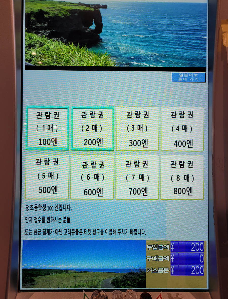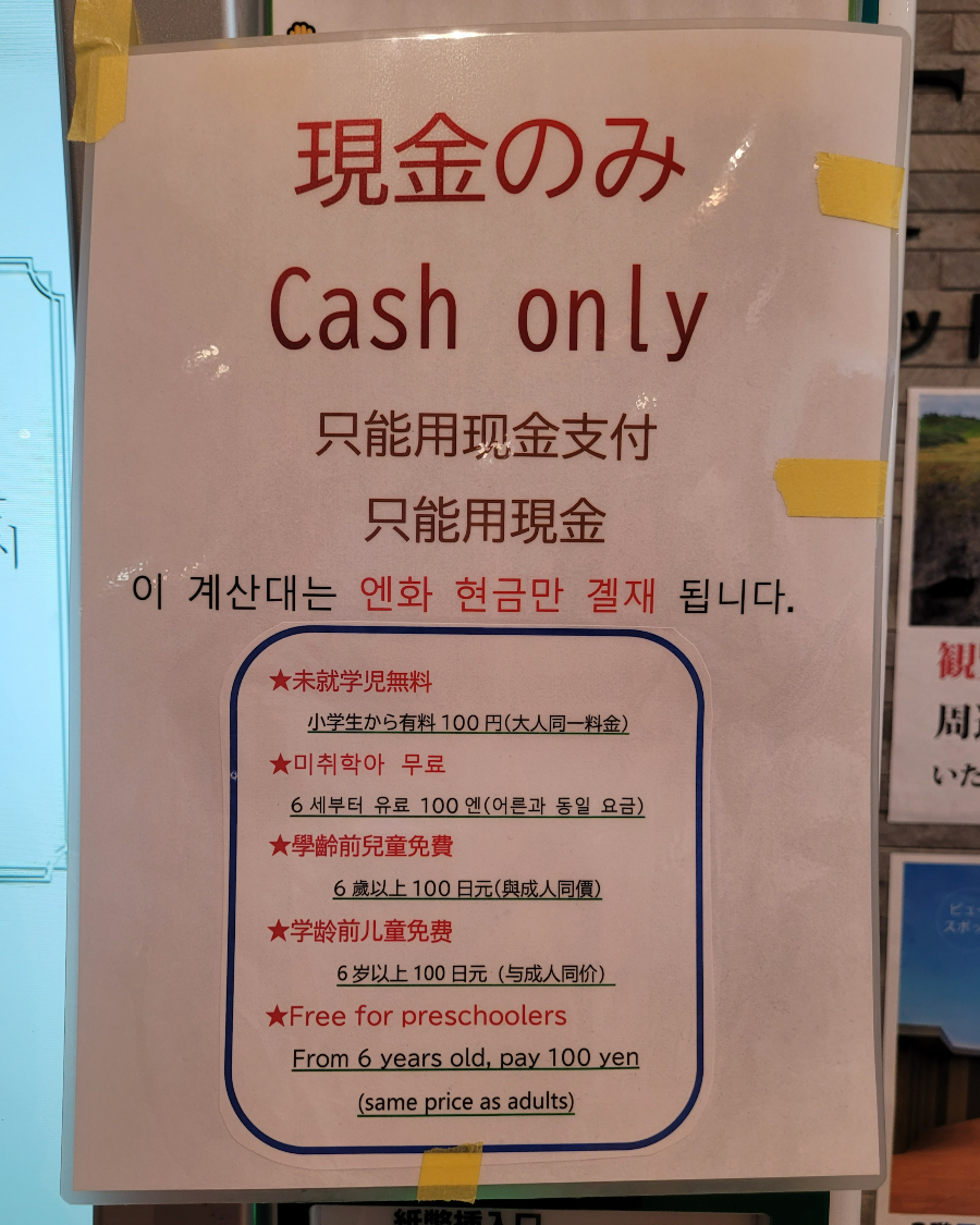 현금이 있을 경우 키오스크로 티켓을 구입할 수 있는데요, 요금은 1인당 100엔으로 부담없는 편이에요. 미취학 아동은 무료이고, 초등학생부터 100엔입니다 :)