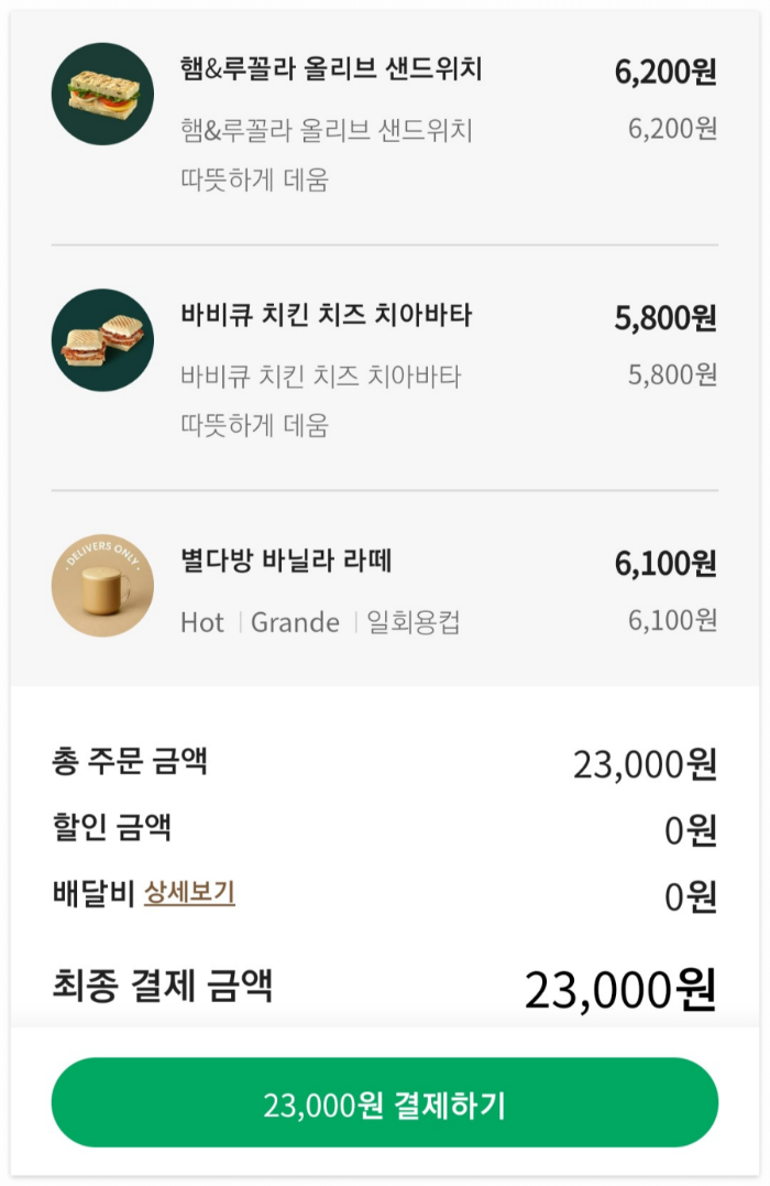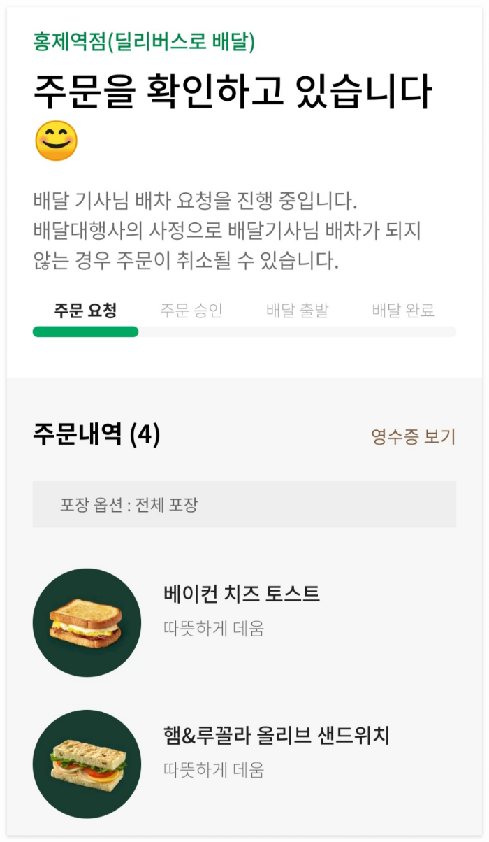 스타벅스 딜리버스 이용시, 프리퀀시 적립도 가능하고 결제도 사이렌 오더와 동일하게 이용할 수 있어서 편리하더라고요. 배달비 3,000원도 많이 부담스러운 가격은 아니라서 필요할 때 종종 이용해도 되겠다는 생각이 들었어요. 무료쿠폰 증정 행사 덕분에 집에서 편하게 브런치를 즐겼습니다 :)