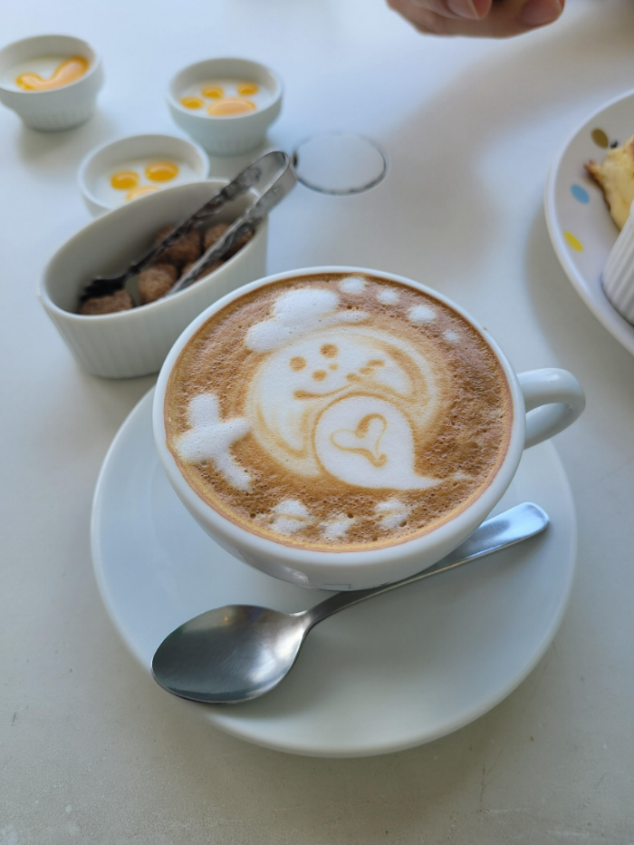 저는 따뜻한 카푸치노를 한 잔 주문했는데요, 이렇게 귀여운 할로윈 라떼 아트를 얹어주셨더라고요 :) 참고로 팬케이크와 커피를 함께 주문할 경우 100엔 할인을 해줍니다.
