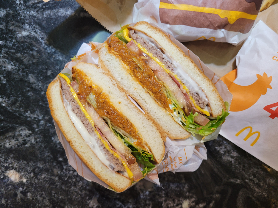 The burger has a thin beef patty on top of mayo, along with cheese, bacon, tomato, lettuce, and chili sauce. It reminds me of the MeatChili flavor I used to have in the United States. I also recall occasionally having chili burgers in school lunches...