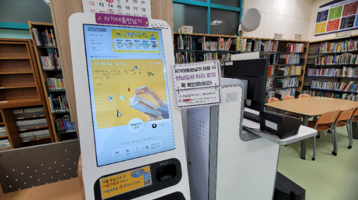 요즘 어딜가나 있는 키오스크. 사서에게 직접 대출/반납해도 되지만 비대면에 익숙해지다보면 키오스크에 사람이 있어도 줄 서 있게되는 아이러니. 자가대출반납기 사용할 땐 책을 꼭 5권씩 나누어서 해야합니다. 안 그러면 에러나요...
