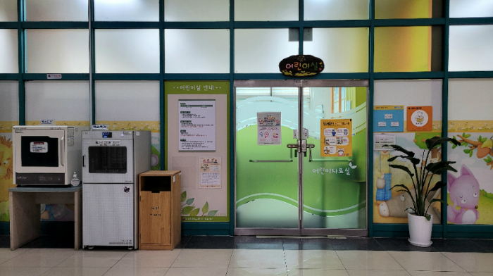 어린이 열람실은 1층 입구로 들어가면 바로 우측에 있어요. 딱 2주만에 갔는데 책 소독기 옆에 쓰레기통이 생기고, 내부 구조도 아주 조금 바뀌었더라고요.