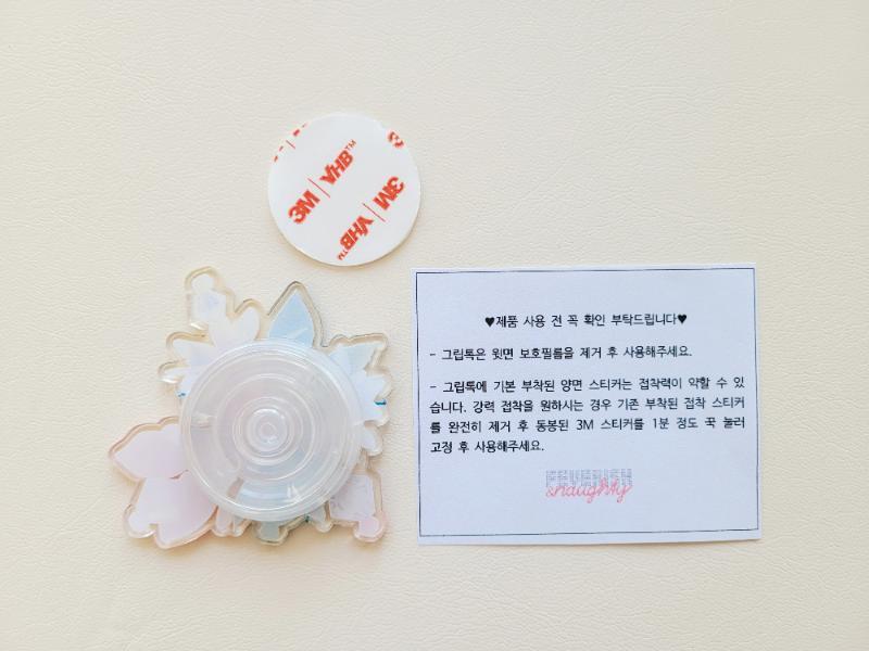 부착형 일반 그립톡과 자석형 맥세이프 그립톡 두 가지 옵션이 있는데요, 저는 모두 부착형 일반 그립톡으로 샀어요. 3M 양면테이프가 별도로 들어있는데, 제품 자체에 붙여진 양면테이프는 접착력이 약하다는 안내 종이가 들어있더라고요.