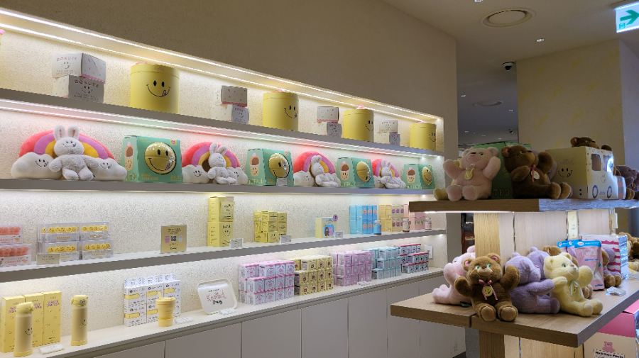 입구에 들어가면, 다양한 굿즈가 전시되어있어요.
