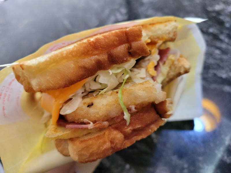 두번째 방문했을 때는 감자 스페셜을 먹어보았어요. 베이컨 베스트에서 무쌈이 빠지고, 해시브라운과 스윗 어니언 소스와 스윗 마요 소스가 추가 된 토스트인데, 베이컨 베스트보다 양이 많아서 먹었을 때 확실히 더 든든하더라고요. (단면을 잘라서 찍은 사진이 아니라 그런지 내용물이 한 눈에 보이지가 않네요..)