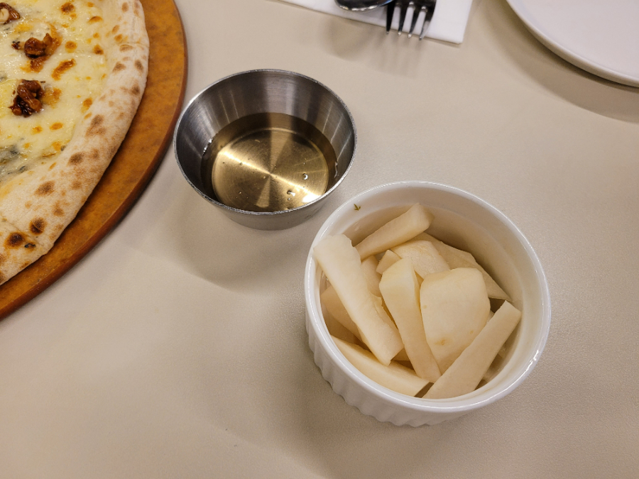 우선 식사 메뉴를 3개 주문했어요. 케이트미는 카운터에서 직접 주문 후 선불로 결제해야합니다. 가장 먼저 피자가 나왔어요. 콰트로 포르마지 피자는, 네 가지 치즈와 호두정과가 들어간 피자에요.
