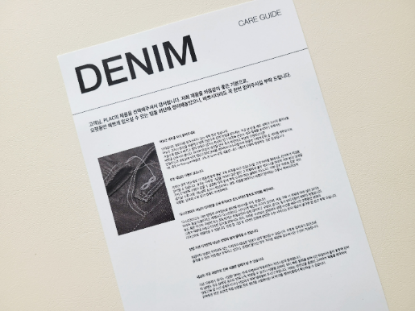 청바지 구입 시 데님 케어 가이드도 같이 받았어요. 역시 세탁은 최대한 하지 않는 방향이 좋고, 냄새를 제거하고 싶을 경우 냉동실에 넣어서 얼리는 방법이 굉장히 생소했어요...