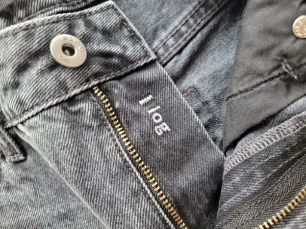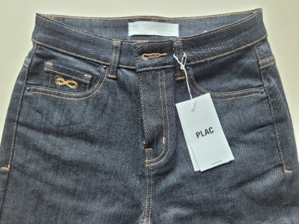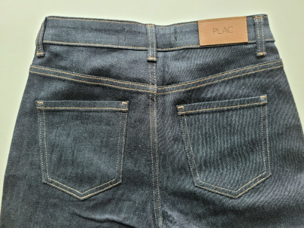 The back pocket has no stitches, and there's a PLAC logo on the waist. It's advisable to avoid machine washing raw denim, particularly with its deep color, as there's a risk of both fading and bleeding. I plan to use a styler at home to maintain the denim's style.