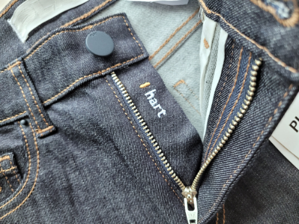'Hart' is embroidered on the zipper side. The jeans I purchased from Redone and Agolde have a button closure, so I find the zipper style more comfortable.