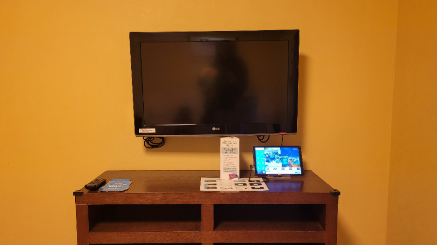 TV 콘솔에 태블릿 PC가 1개 올려져있는데, 디지털 컨시어지로 어매니티 요청, 룸서비스, 체크아웃 등 다양한 서비스를 이용할 수 있어요.