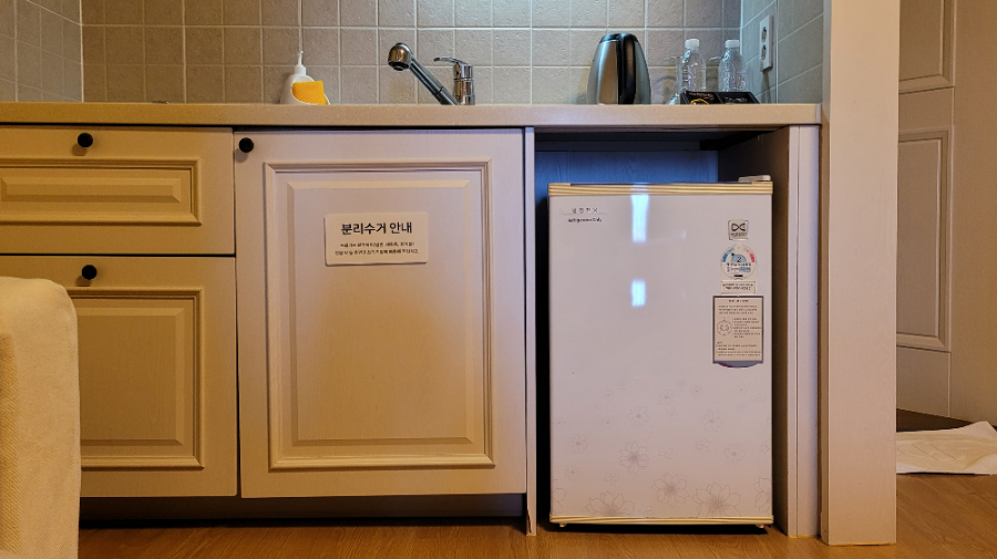 전기포트 아래쪽에 미니 냉장고도 있고요 :)