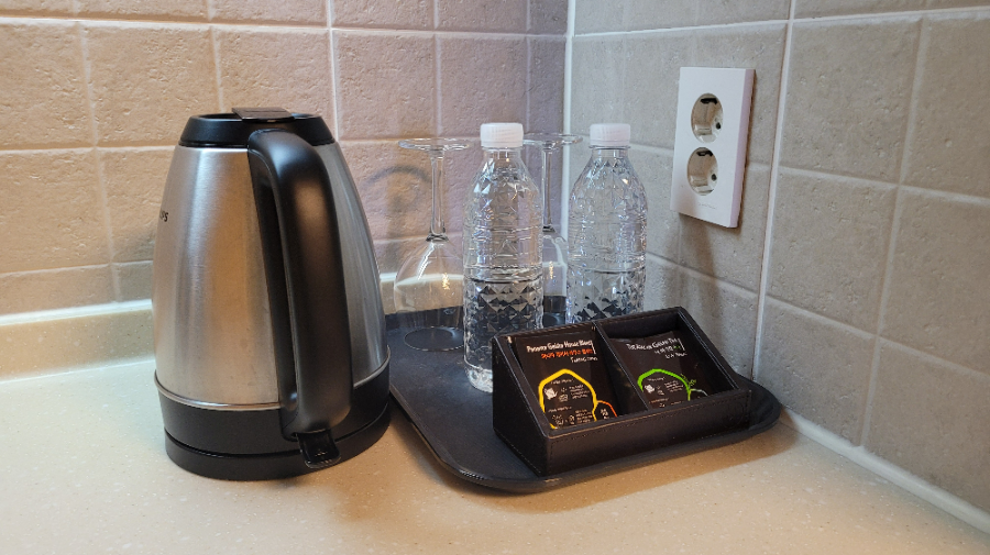 Two 500ml bottles of water, coffee and green-tea tea bags were provided just like a hotel.