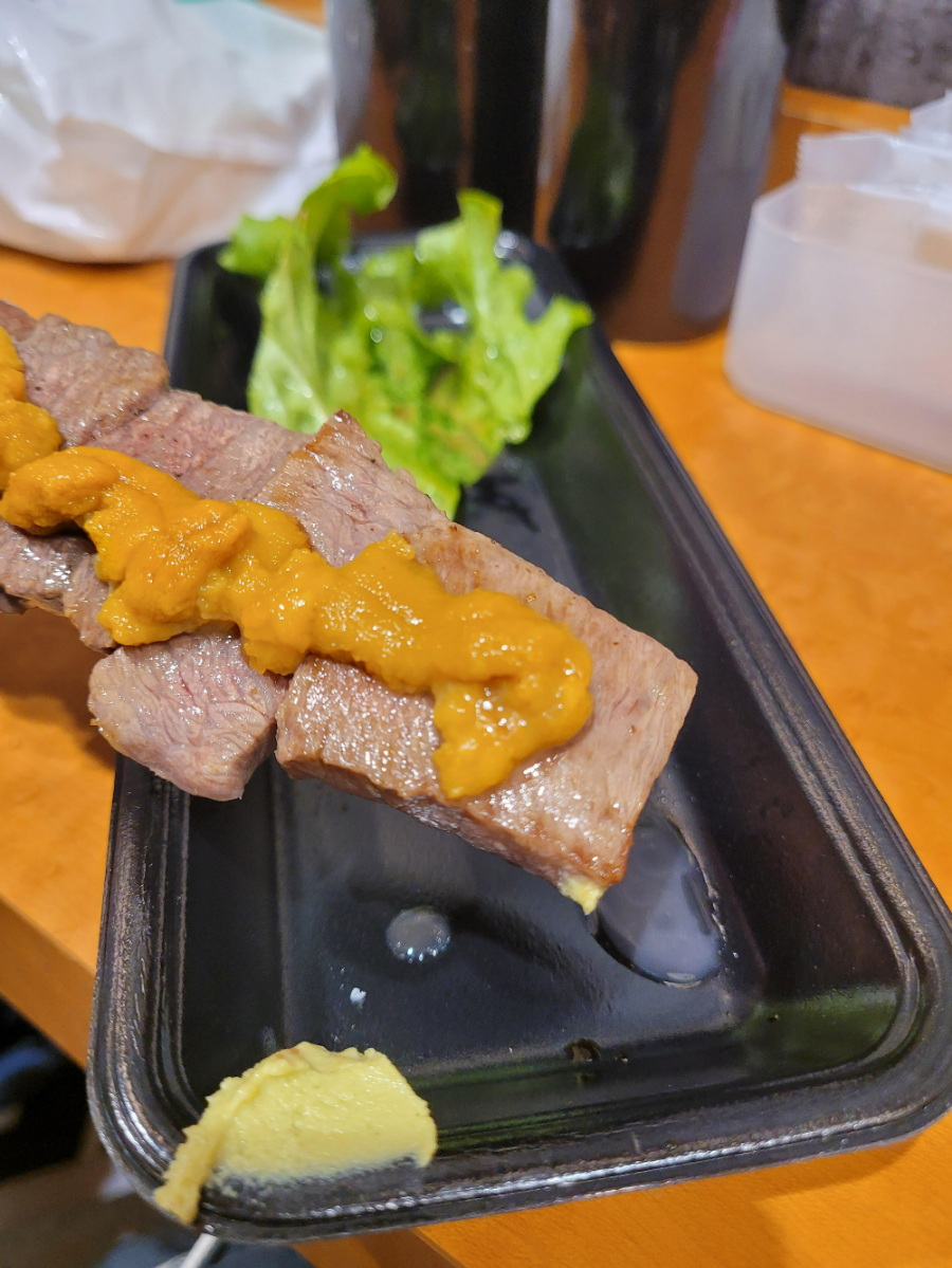 I ordered the Wagyu skewers topped with sea urchin roe, while my partner chose the A5 Rank Sirloin, and my child, who loves shrimp, ordered shrimp skewers.