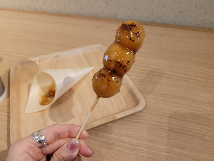 The sight of three pieces of mochi (rice cake) lined up together was truly adorable. The chewy rice cake topped with sweet sauce made it delicious. While dango is also available in Osaka convenience stores, trying it for the first time in Kyoto made it a memorable experience.