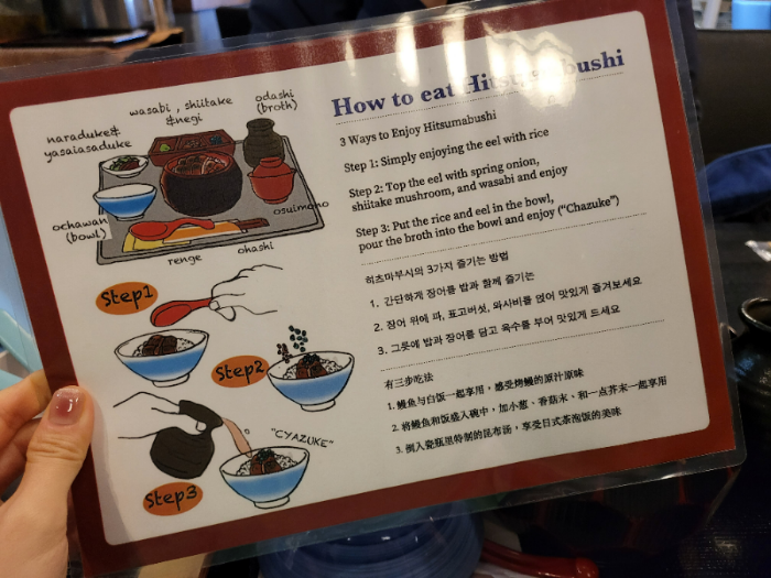 After placing my order, I observed the instructions on how to enjoy Hitsumabushi. Depending on preferences, you can savor it like a rice bowl or pour the broth over it to enjoy it like chazuke. It's easy to order as the menu is entirely written in Korean and English.