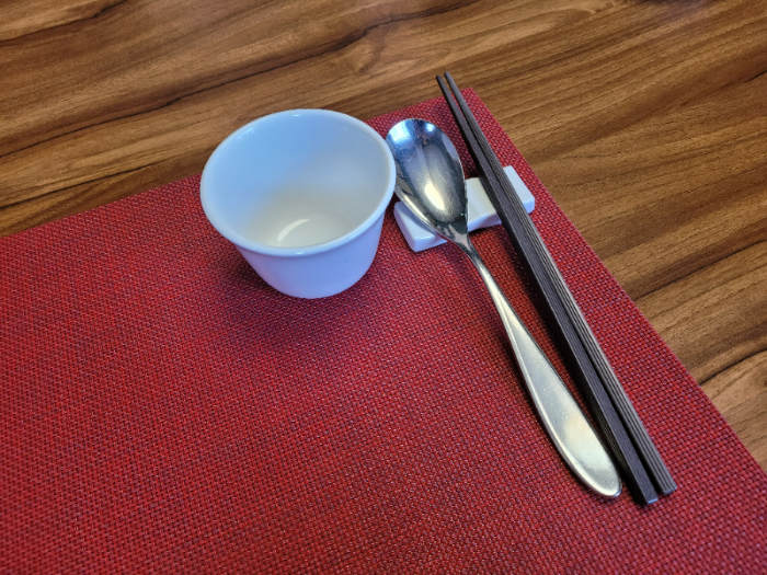 테이블 매트와 수저가 놓인 모습도 한 장 찍어보고, 주문한 음식을 기다렸어요. 평일 점심 룸으로 예약할 경우 코스를 주문하거나, 인당 주문해야하는 최소 금액이 정해져 있었는데 정신없던 하루라 기억이 가물가물합니다...