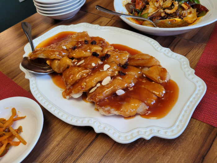 We ordered the Chapssal Tangsuyuk (Sweet and Sour Crispy Pork), one of my child's favorite dishes. The sauce was served poured over the pork.