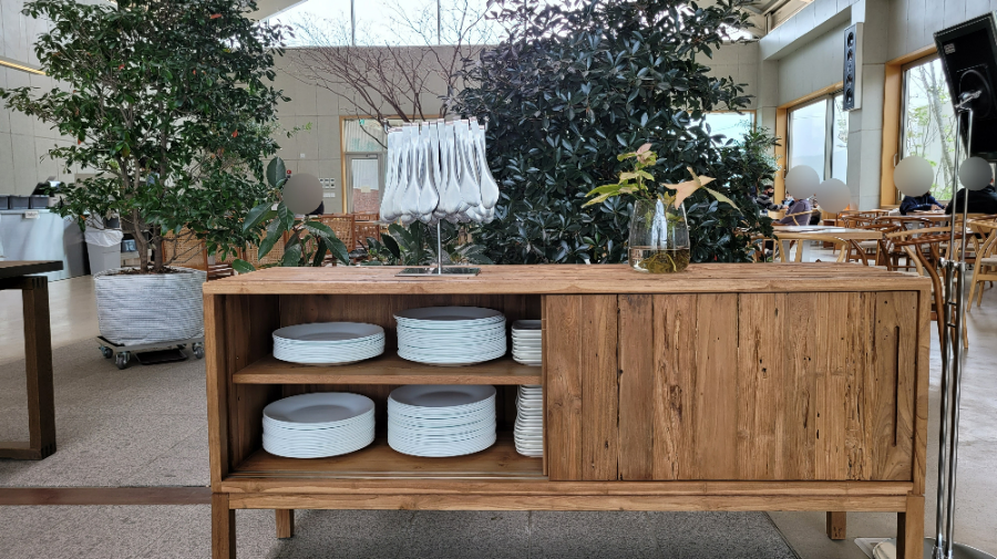 저희는 황사 때문에 내부에만 있었어요. 층고가 높고 테이블 간격도 넓어서 쾌적하더라고요. 곳곳에 식재된 식물들 덕분에 공기도 왠지 맑을 것 같은 느낌이에요.