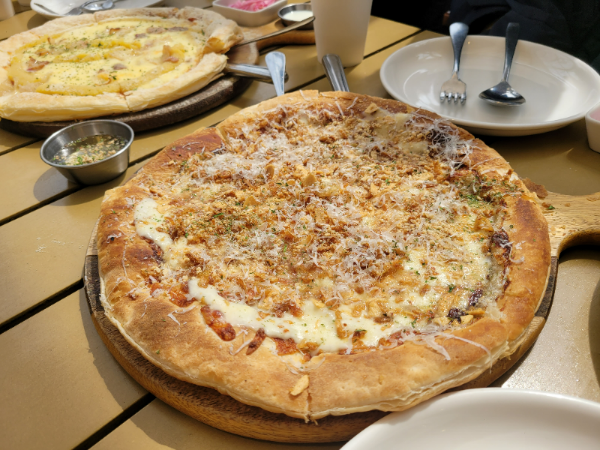 피자는 가장자리가 바삭바삭하고, 토핑도 듬뿍 올라간 편이라 맛있더라고요. 고구마 베이컨 피자는 요거트 소스와, 고르곤졸라 피자는 꿀과 함께 곁들여먹는 피자였어요.