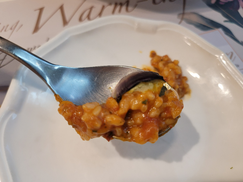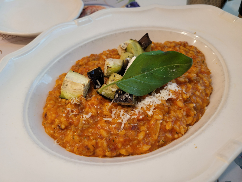 The creamy tomato sauce risotto topped with roasted eggplant was delicious. It's not spicy, making it a great dish to share with children.
