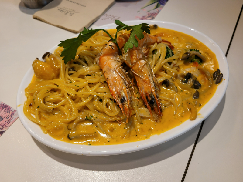 The spicy shrimp pasta is enhanced with chili oil in a soybean-cream sauce, and it's packed with plenty of mushrooms and shrimp. Personally, it's my favorite pasta at Dr. Robbin.