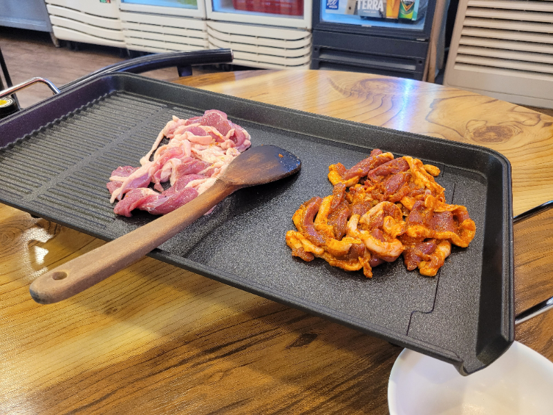 반찬을 가져오다 보니, 직원분이 불판에 고기를 올려주고 가셨더라고요. 고기 구우랴, 반찬 리필해 오랴, 셀프로 다 해야 하다 보니 조금 정신없긴 합니다...