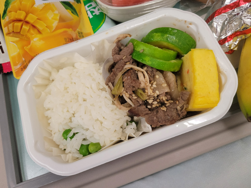 The main dish beef bulgogi, was accompanied by fruit, juice, a muffin, and snacks. Since it was breakfast, a banana was also included. (Just a note: when disembarking and going through customs, packaged snacks are fine, but you can't bring the banana with you...)