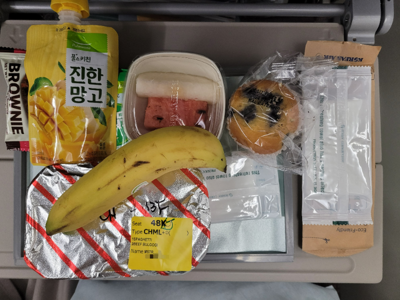 메인 요리인 소불고기에, 과일, 주스, 머핀, 간식 등이 나왔고, 아침식사라 그런지 바나나도 추가되었어요. (참고로 비행기에서 내려서 입국할 때 포장된 과자는 괜찮지만, 바나나는 들고 내리면 안된다네요...)
