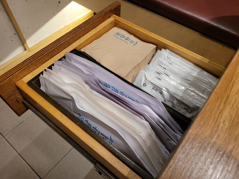 The utensils, napkins, and wet wipes are located in a drawer next to the table.