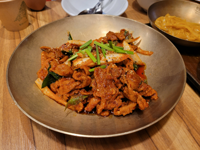 메인 반찬은 가장 마지막에 나왔어요. 제주 흑돈 숯불구이는 제육볶음 느낌인데 많이 맵지 않고 맛있었어요.