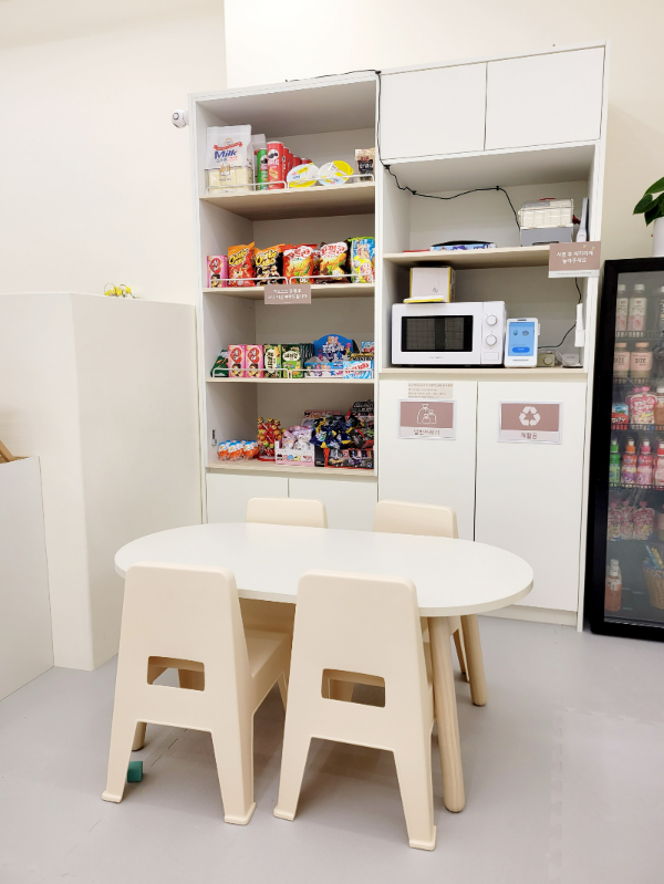 아이들을 위한 작은 테이블도 있고, 셀프로 사용 후 계산할 수 있는 미니바도 있어요. 간단한 간식이나 음료는 매장 안에서 구매할 수 있더라고요. 전자레인지도 있기 때문에 간단하게 이유식을 데워먹을 수도 있습니다.