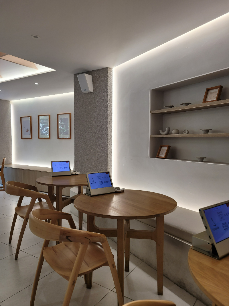 The window offers a view of the Bosingak Bell and lush green leaves. Orders can be placed conveniently using the tablet on the table.