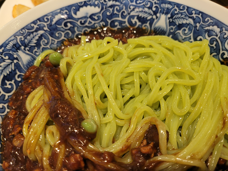The noodles were green, and they were chewy and delicious.